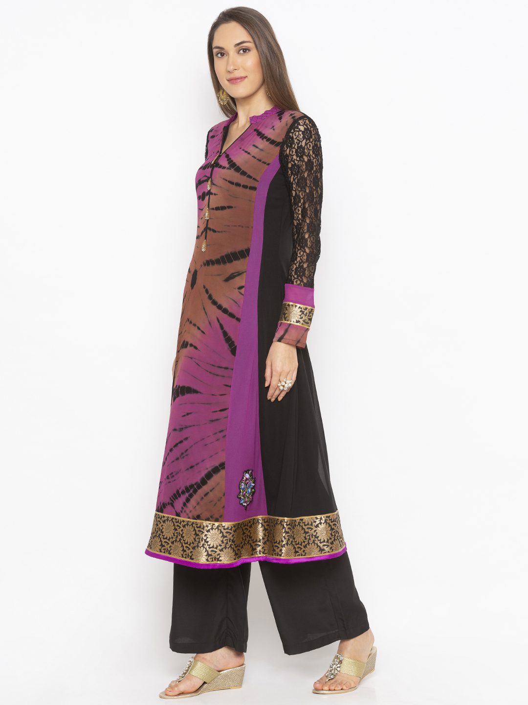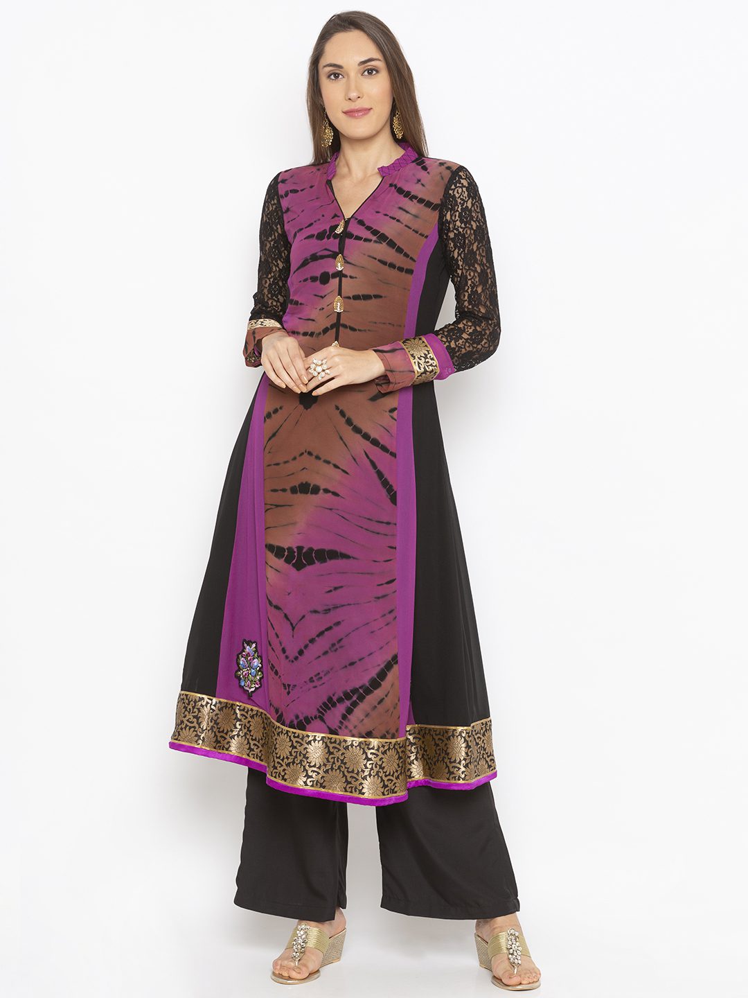 Purple Black Tie Dye Batik Style Shaded Kalidar Kurta With Black Lace Piece Full Sleeves With Embroidered Buttons And Motifs And Brocade Border With Detailing In Ghera And Chinese Collar