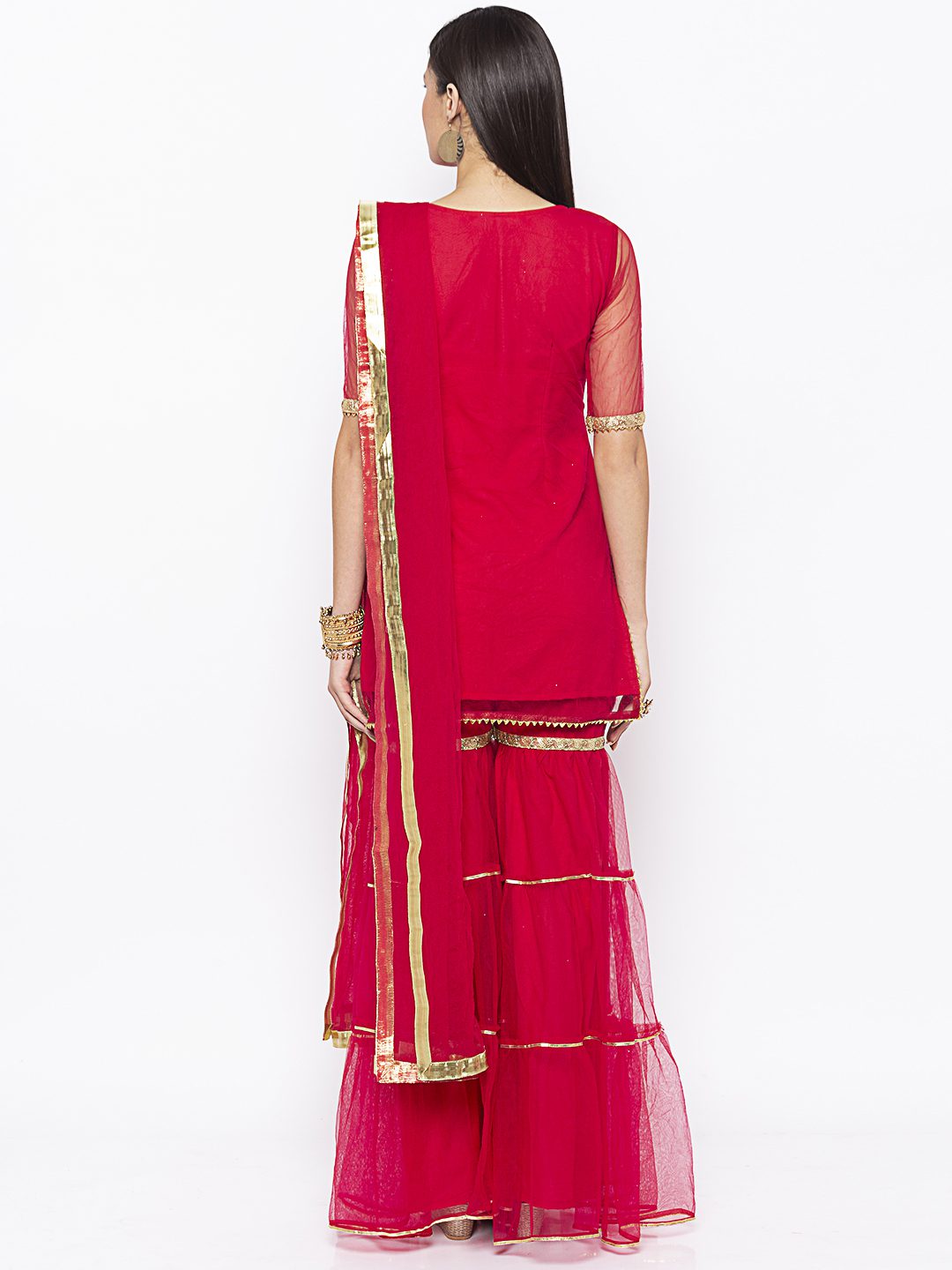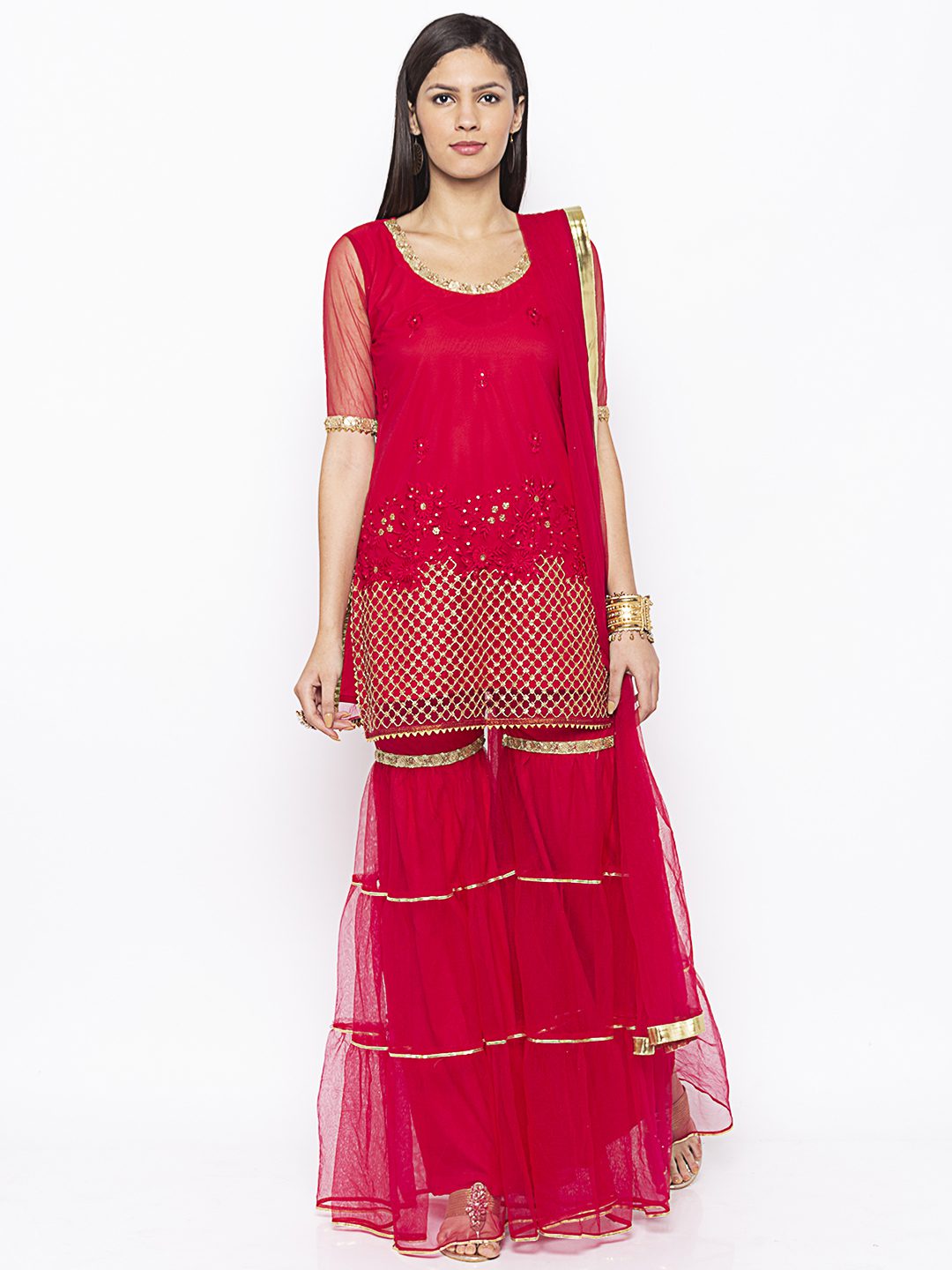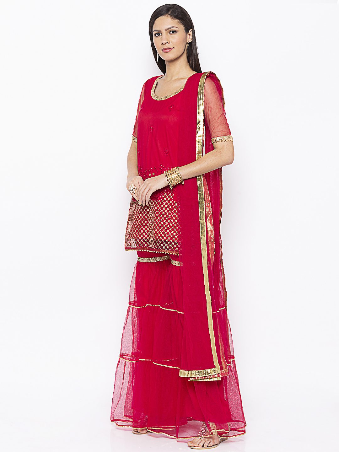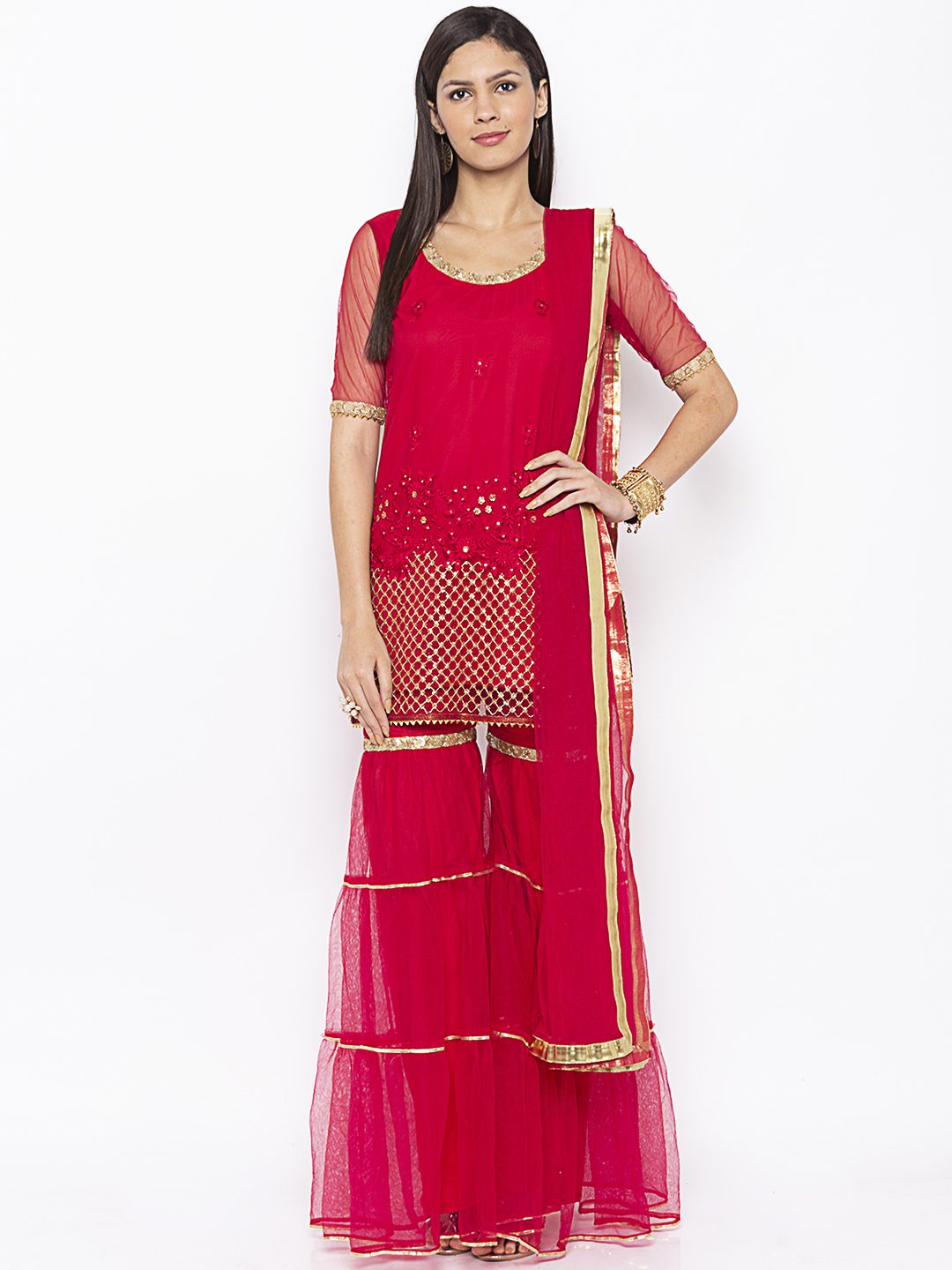 Rani pink net short kurta heavy embroidered elbow sleeves with lace detailing on neck sleeves and Sharara worn with net tiered 2 Pauncha Sharara and net Dupatta with gold borders on it