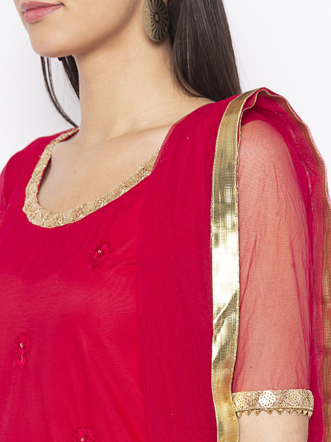Nikhaar Creations Rani pink Embroidered Net Sharara Kurta Dupatta Set