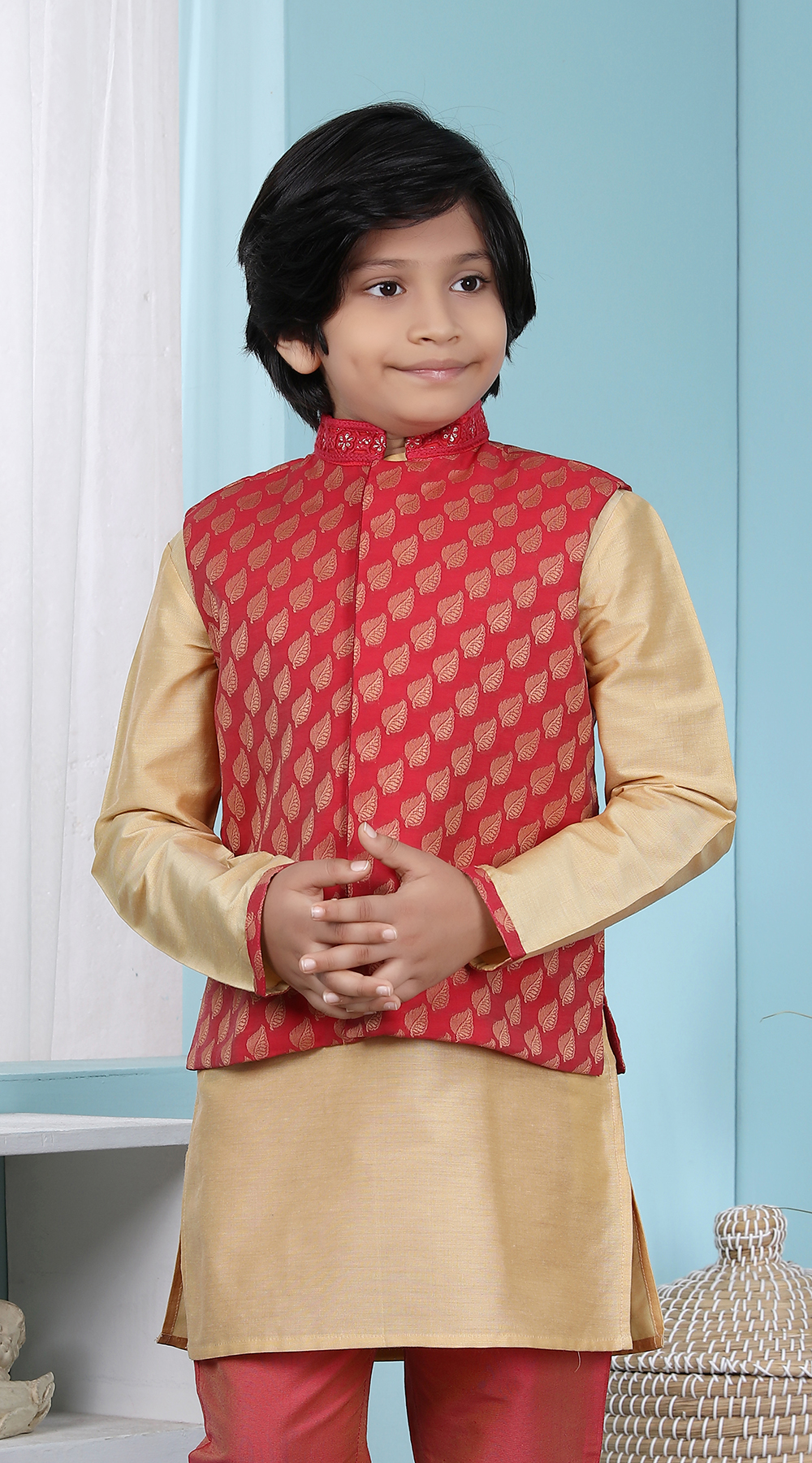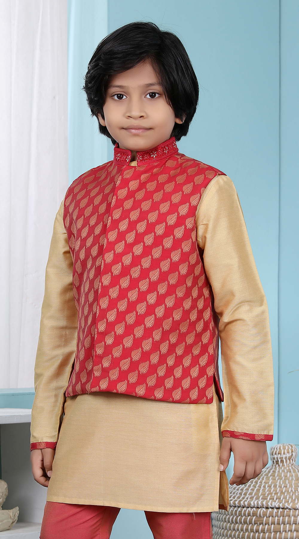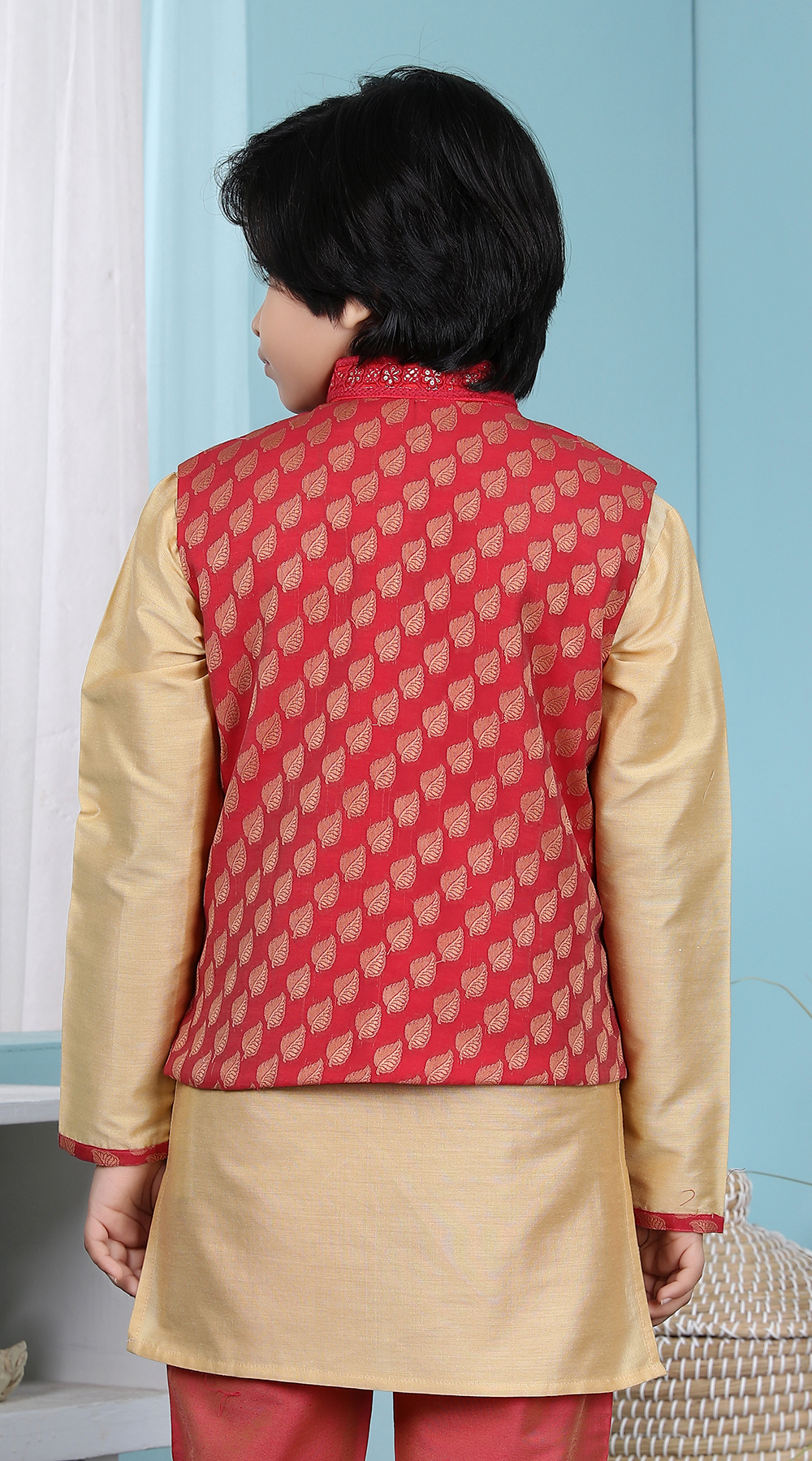 Red Banarasi Silk Printed Boys Bandi Jacket