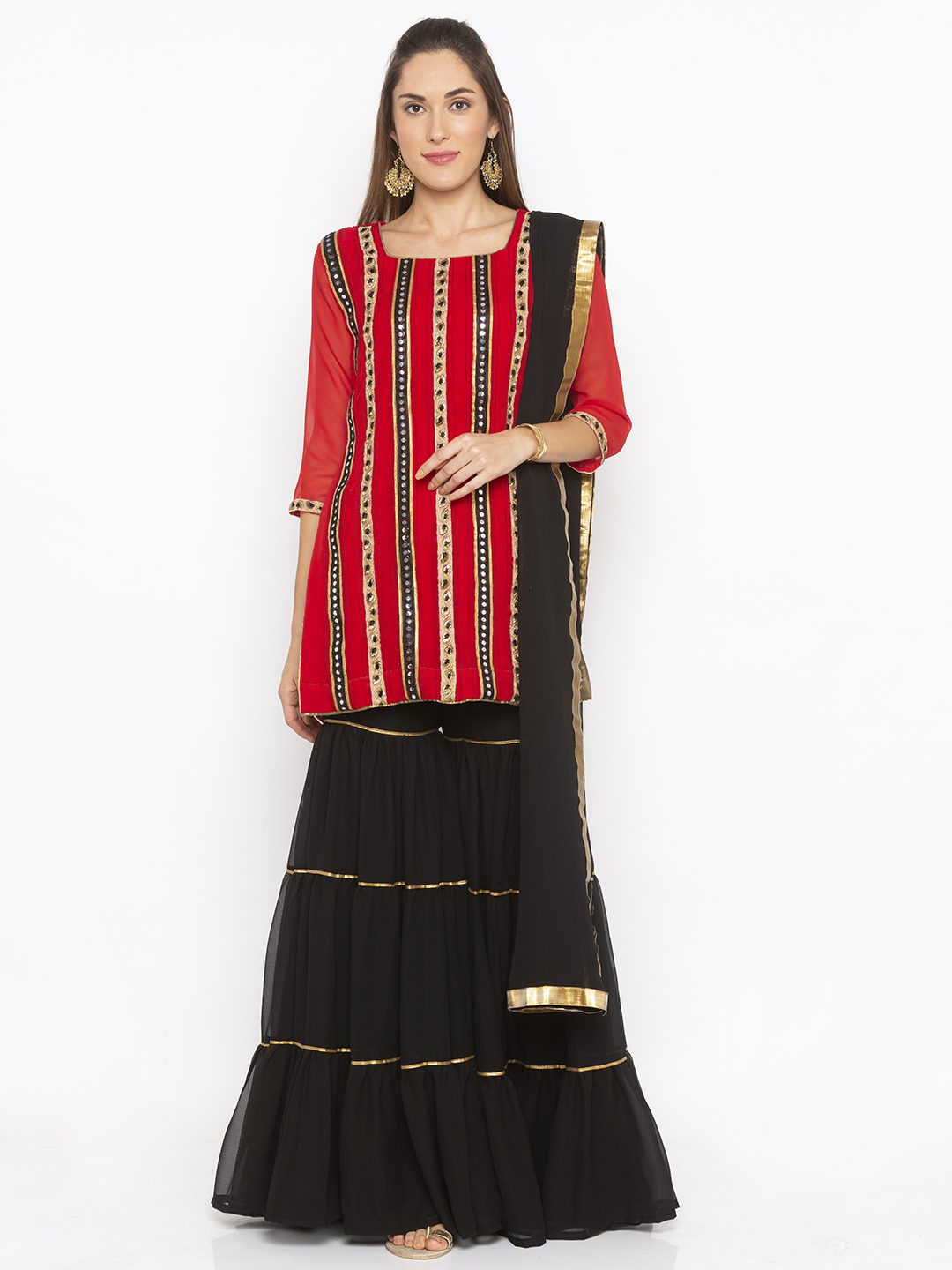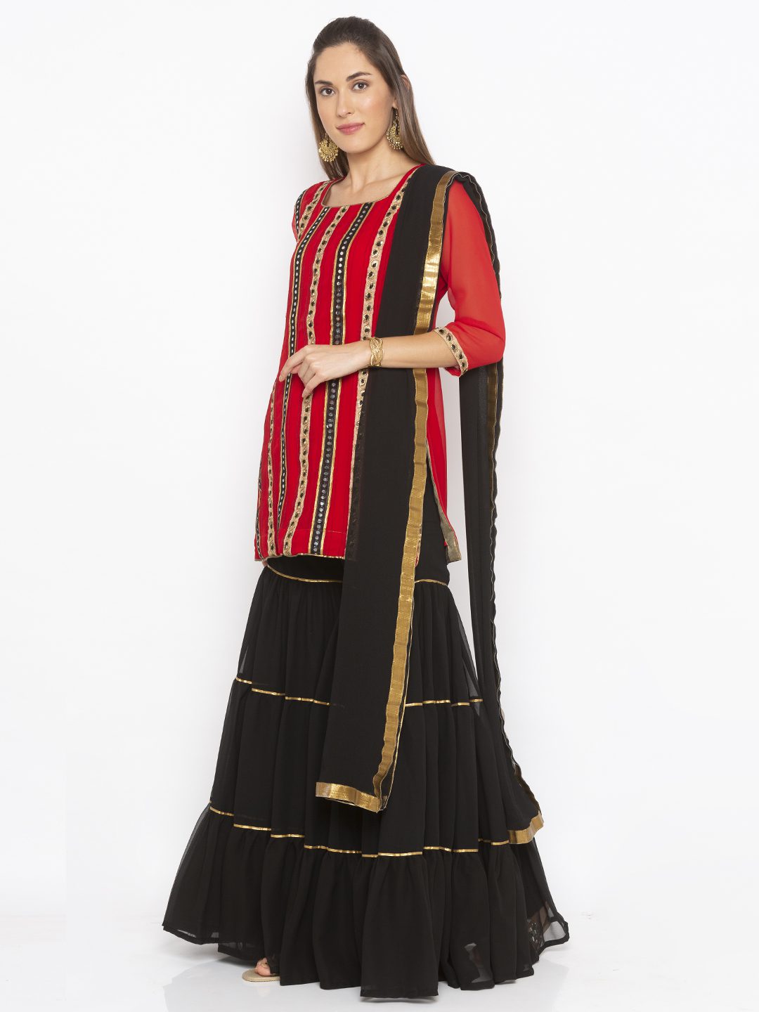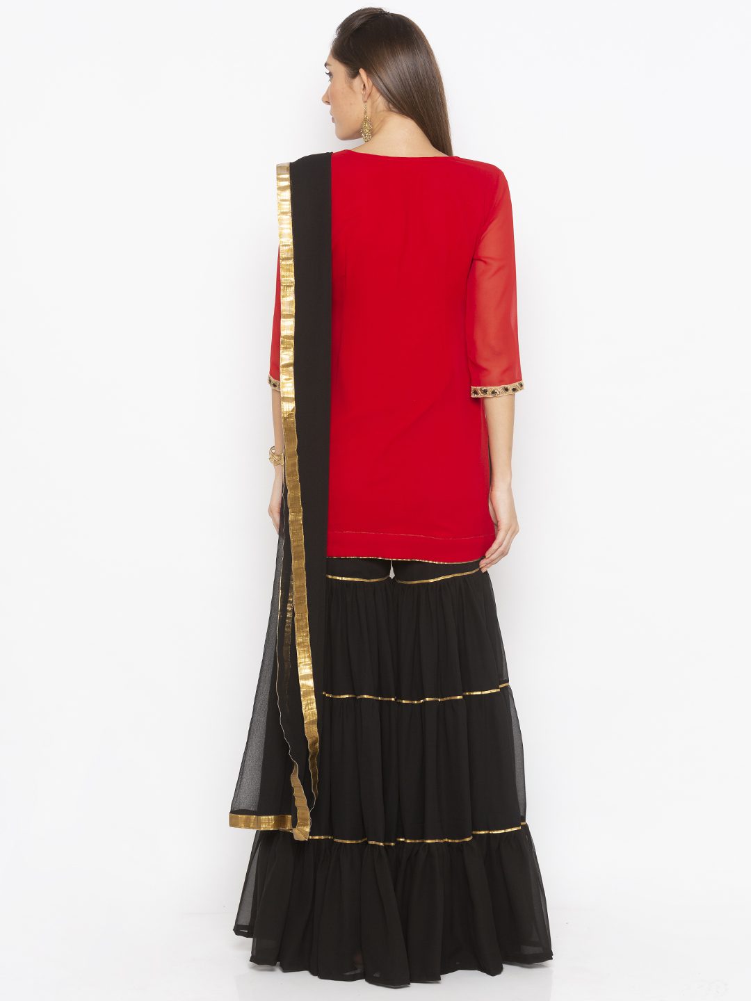 Red Georgette MultiPanel Embroidered Short Kurta With 3 Quarter Sleeves Worn With Tiered Georgette 2 Pauncha Gharara With Gold Gota Patti And Black Chiffon Dupatta With Gold Border On It.