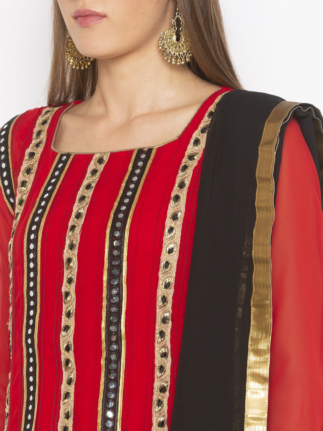 Nikhaar Creations Red Embroidered Georgette Sharara Kurta Dupatta Set